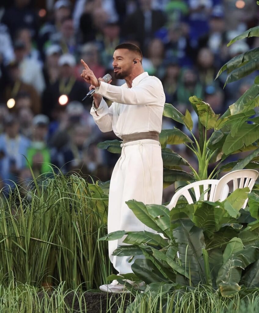 Su presentación estuvo cargada de simbolismo: Jíbaros, guitarras, una zafra de azúcar, un juego de dominó, una piragua (nuestro raspa’o), orquesta de salsa, banderas de todos los países del continente y un balón de fútbol americano que decía “Juntos somos América”.