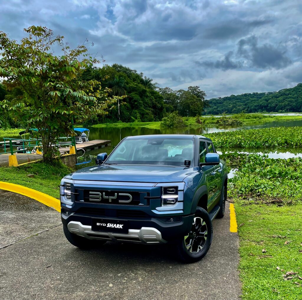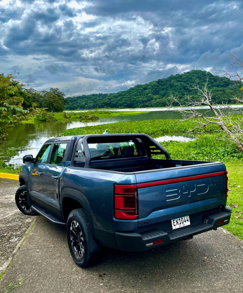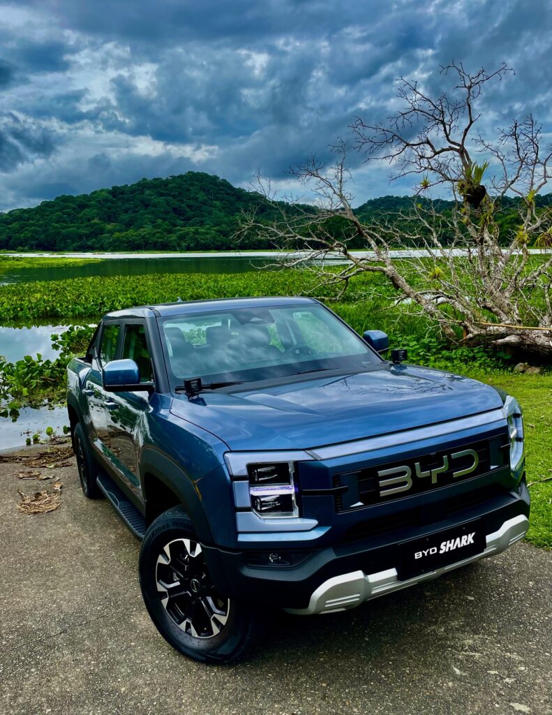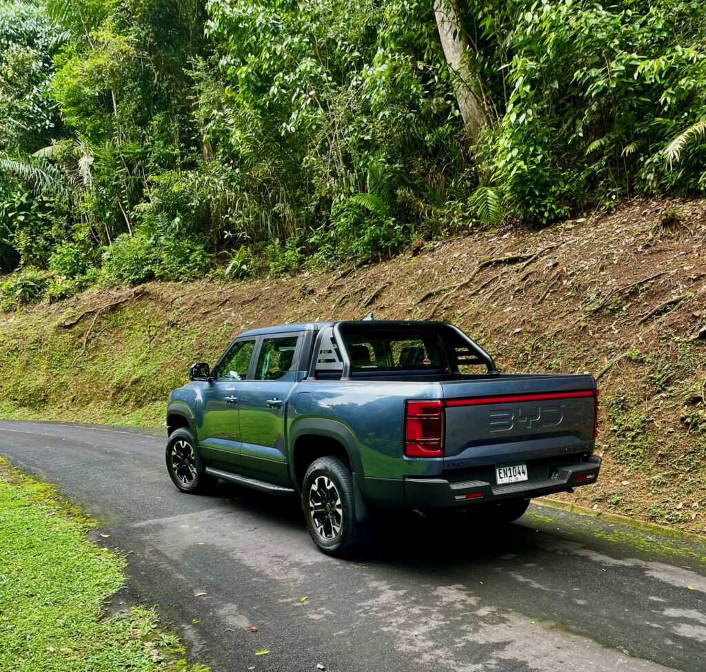 La suspensión es independiente en cada extremidad usando horquillas dobles y resortes helicoidales. De facto no hay marcha corta (low range) o conexión alguna entre el tren de marcha delantero y el tren trasero.El espacio amplio en la cabina es muy apreciado. Cuando BYD sacó la cabeza de debajo del agua con el Shark, me imagino la competencia tembló.No solo esta su interior por encima de la competencia.Conducirlo al principio no es normal ya que no hay ruidos cuando acelero. Es impresionantemente suave y refinado, cuando el motor necesita activarse, es suave y silencioso, claro yo acoplo el modo de conducción Sport. La aceleración me impresiona, para un equipo así de pesado en este segmento y tengo que recordar que no es un sedán. La experiencia de manejo es diferente ya que la entrega de fuerza es eléctrica porque el motor se usa como un generador para las baterías y el feeling es sólido y absorbe las imperfecciones magníficamente siendo la amortiguación muy suave – extraño en este segmento -.Me recuerda los autos norteamericanos grandes. Para ser un doble cabina, lo mejor sugiero, es dejarlo hacer lo que quiere, cuando quiere,para mantener la batería cargada, enciende el motor cuando lo necesita y ofrece esta magnifica autonomía. Todo esta bien ordenado y disponible en la cabina,aun usando guantes de trabajo los botones son ideales.