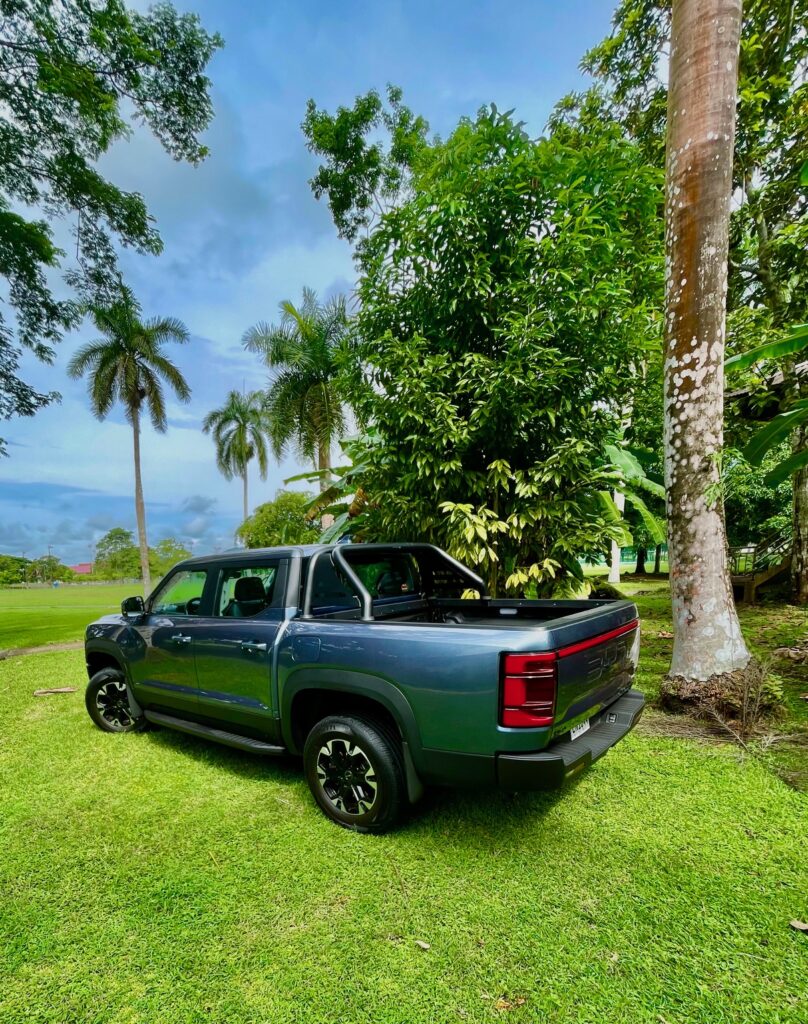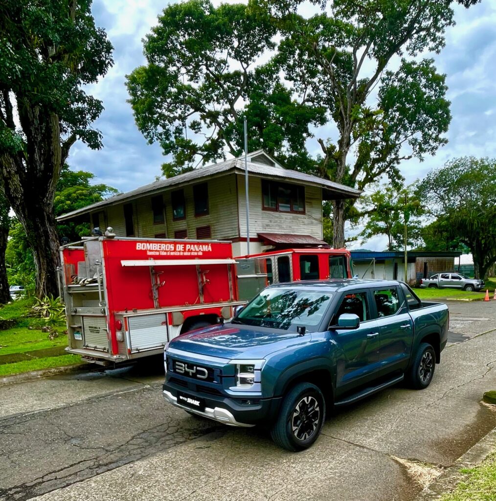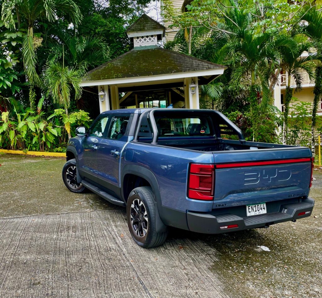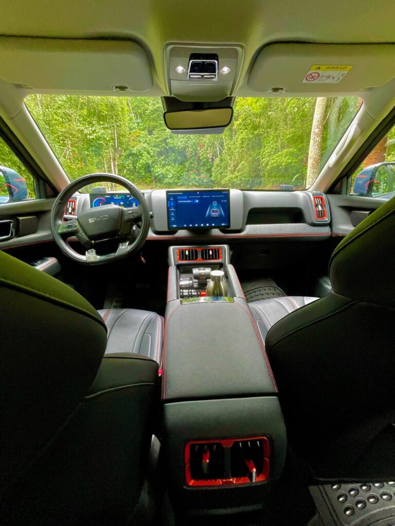La suspensión es independiente en cada extremidad usando horquillas dobles y resortes helicoidales. De facto no hay marcha corta (low range) o conexión alguna entre el tren de marcha delantero y el tren trasero.El espacio amplio en la cabina es muy apreciado. Cuando BYD sacó la cabeza de debajo del agua con el Shark, me imagino la competencia tembló.No solo esta su interior por encima de la competencia.Conducirlo al principio no es normal ya que no hay ruidos cuando acelero. Es impresionantemente suave y refinado, cuando el motor necesita activarse, es suave y silencioso, claro yo acoplo el modo de conducción Sport. La aceleración me impresiona, para un equipo así de pesado en este segmento y tengo que recordar que no es un sedán. La experiencia de manejo es diferente ya que la entrega de fuerza es eléctrica porque el motor se usa como un generador para las baterías y el feeling es sólido y absorbe las imperfecciones magníficamente siendo la amortiguación muy suave – extraño en este segmento -.Me recuerda los autos norteamericanos grandes. Para ser un doble cabina, lo mejor sugiero, es dejarlo hacer lo que quiere, cuando quiere,para mantener la batería cargada, enciende el motor cuando lo necesita y ofrece esta magnifica autonomía. Todo esta bien ordenado y disponible en la cabina,aun usando guantes de trabajo los botones son ideales.
