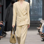 La expresión de The Collection otoño 2026 se transmite a través de piezas esenciales: trajes sastre, trench coats, blusones, abrigos y vestidos combinados con stilettos, flats, botas, clutches y bolsos tipo duffle, además de guantes en tonos monocromáticos. El denim cobra protagonismo mediante una reinterpretación del archivo de 1976, el primero presentado en la pasarela de Calvin Klein: un traje completo de denim llevado bajo abrigos de silueta esbelta, y el logotipo original escrito a mano bordado en una chaqueta aviador y en un trench coat a cuadros.