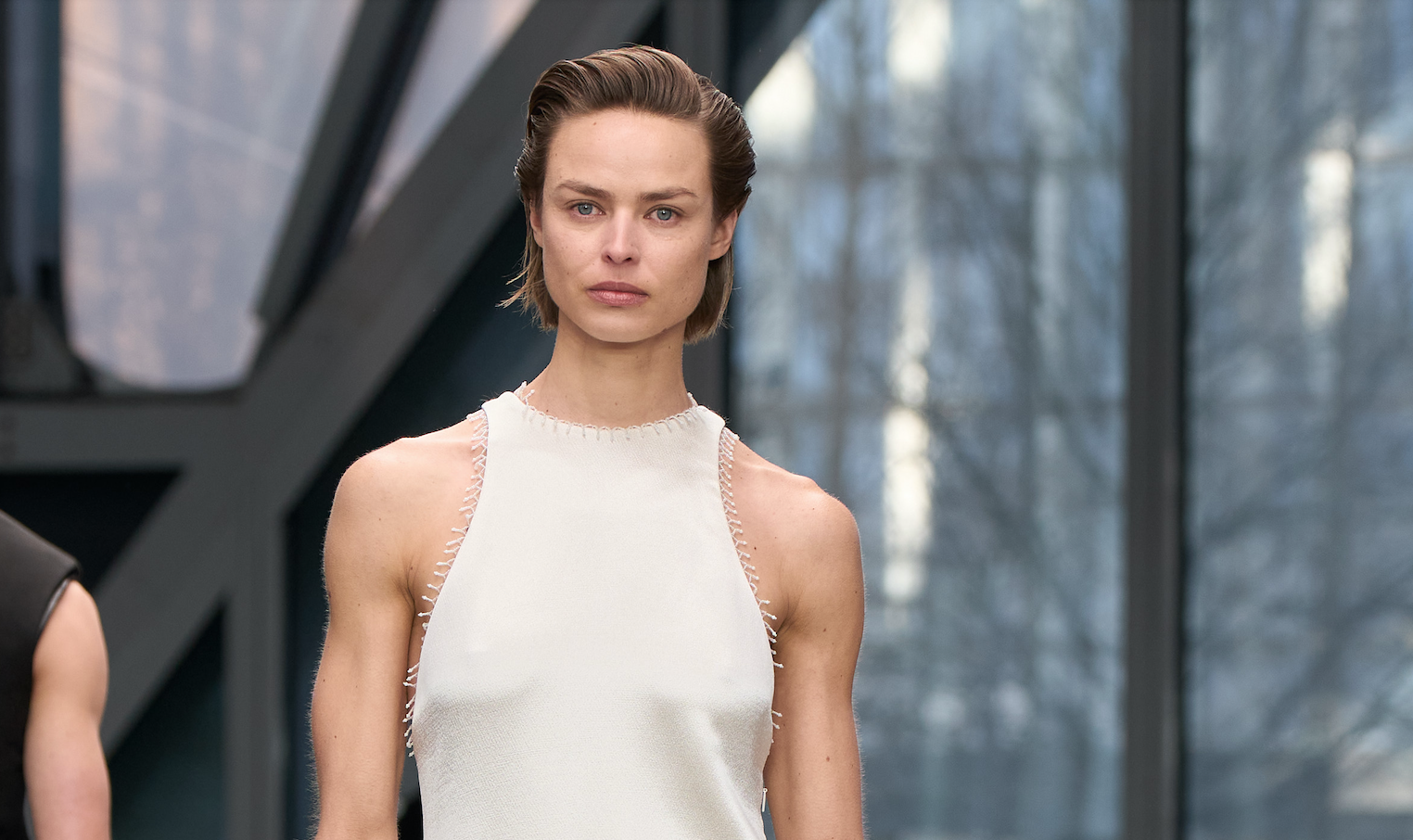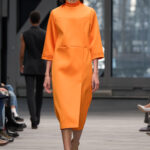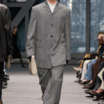 A lo largo de los distintos estilos, la silueta es alta y recta; la sastrería precisa y ajustada, con inesperadas espaldas descubiertas y detalles sin mangas, crea tensión, mientras que los vestidos intensamente trabajados presentan espaldas lisas en contraste que revelan su estructura interna.