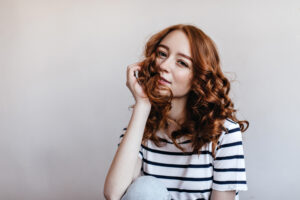 Elegant ginger woman touching her hair with smile. Studio photo of dreamy european girl with beautiful eyes.