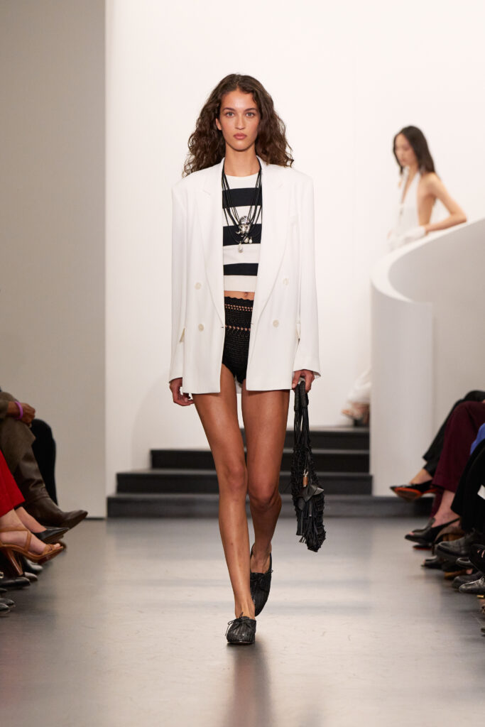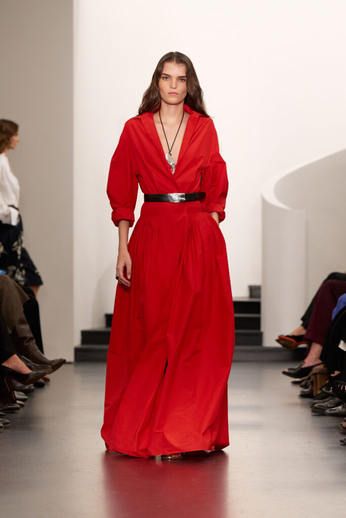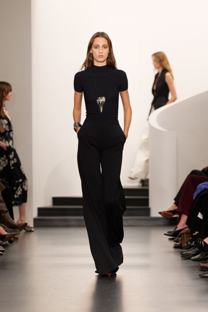 Es una soñadora y una hacedora cuyas elecciones de estilo reflejan esa dualidad interior. Su estilo audaz proyecta una actitud modernista basada en una sencillez minimalista, pero con una corriente de suavidad. La sastrería precisa en una paleta impactante de negro, blanco y rojo crea drama, mientras que las sutilezas del corte, y especialmente de los materiales, hacen que las prendas sean profundamente personales. Dentro de ese marco, abundan los contrapuntos sugerentes. Siluetas seductoras combinan líneas ajustadas al cuerpo con volumen extremo. Los tópicos clásicos son subvertidos con giros inesperados. La joyería escultórica de plata brillante oscila entre lo elegante y lo impactante, mientras que los sombreros de ala ancha añaden un toque de misterio romántico.